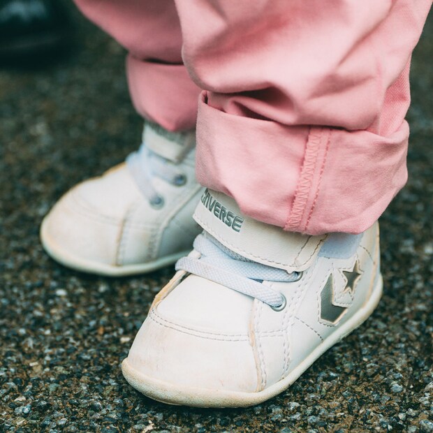 『コンバース』のスニーカーは、動きやすく秋の公園遊びにぴったり。ホワイトカラーでコーデを軽やかにクラスアップ!