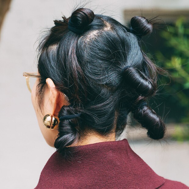 お団子が散りばめたヘアアレンジで個性発揮! 対してメガネやゴールドのピアスで、大人っぽく抑えたのがグッド。