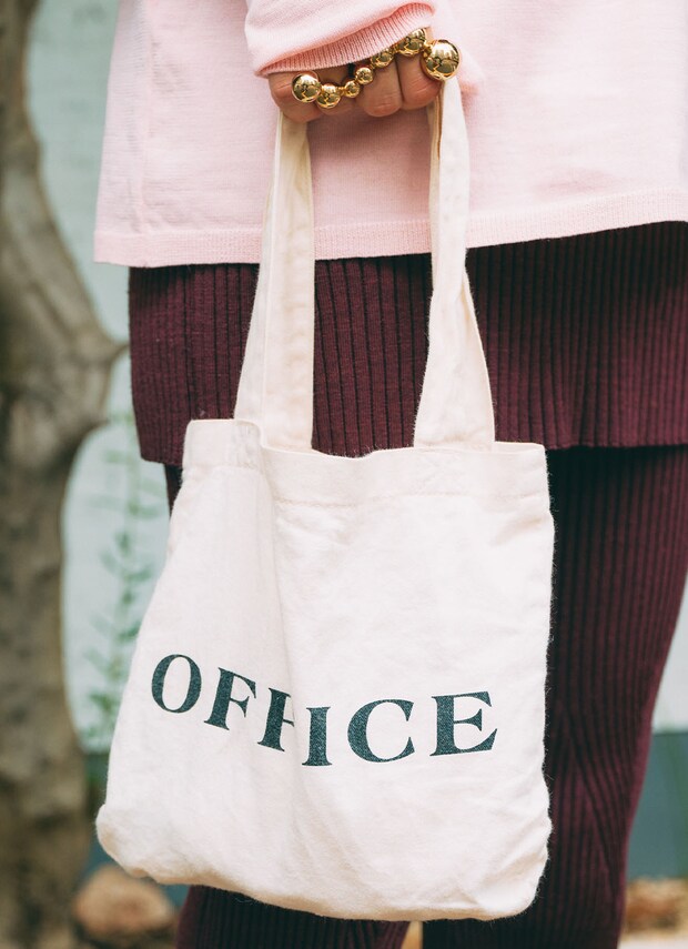 インパクトのある『ソワリー』の2連リングが好アクセント。コットン生地のトートバッグで、カジュアルダウンしたバランス感はお見事!