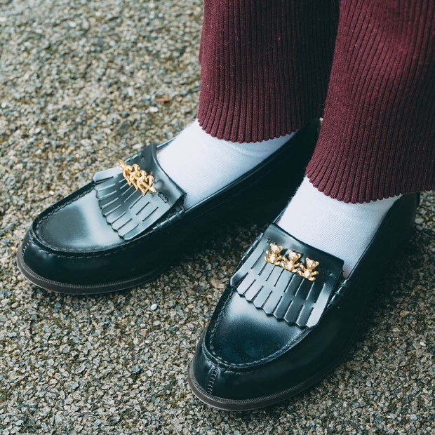 ローファーに添えられた、ゴールドチャームがなんとも可愛い! 白のソックスと組み合わせて、トラッドに決めて。