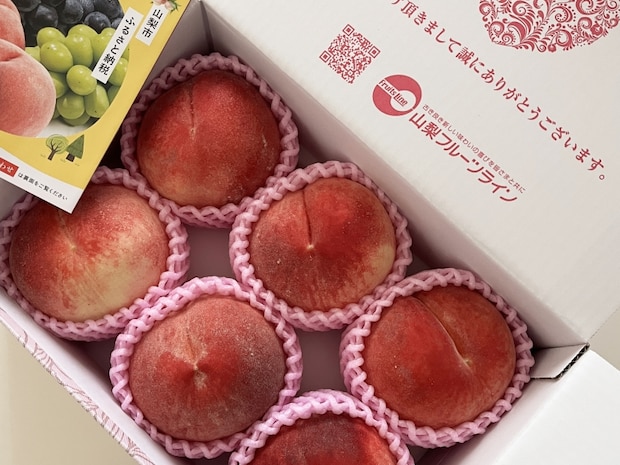 山梨県山梨市のふるさと納税人気返礼品「桃 約2kg 5~8玉 朝もぎ直送! 旬の完熟『桃』選び抜かれた桃」。富士の見えるくだもの畑から、朝もぎ直送される完熟桃は、大きくてみずみずしく、甘くて香りもある最高の白桃です。皮も剥きやすく、丁寧に梱包されているので贈り物にも良さそうです。