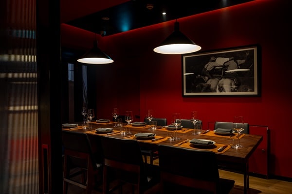 「ラティーナ パリージャ」の店内は、赤と黒のシックなインテリアと温かみのある照明の上質な空間。2名から20名まで個室も利用できる。会食や記念日、接待など、大事な時間を特別な空間で過ごすことができる。