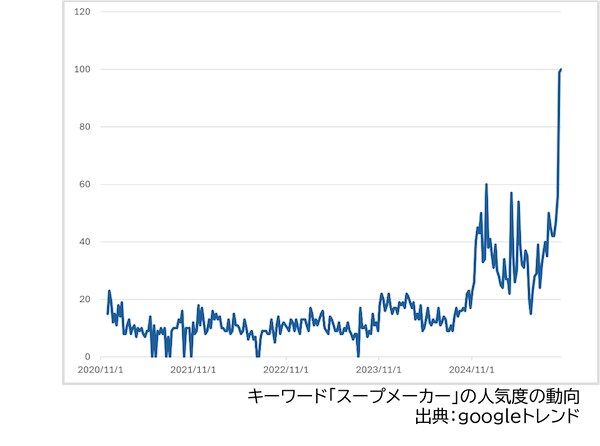 インターネットにおいて「スープメーカー」をキーワードとした検索が、2024年11月以降高まりを見せていることからも、市場の関心の高さがうかがえる。