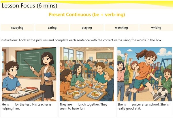 Lesson Focusでは、イラストを見ながら、動作や場面を英語で表現する練習を行う。現在進行形verb+ingなど、文法項目を視覚的な理解を通して自然に身につける。
