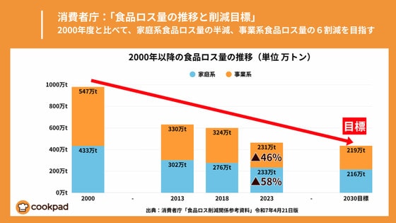 日本では年間464万トンの食品ロスが発生しており、家庭からの食品ロスは半分近くを占めます。2000年と比べると全体で53%削減と進展していますが、事業系58%削減に対し、家庭系は46%削減にとどまっています(※3)。