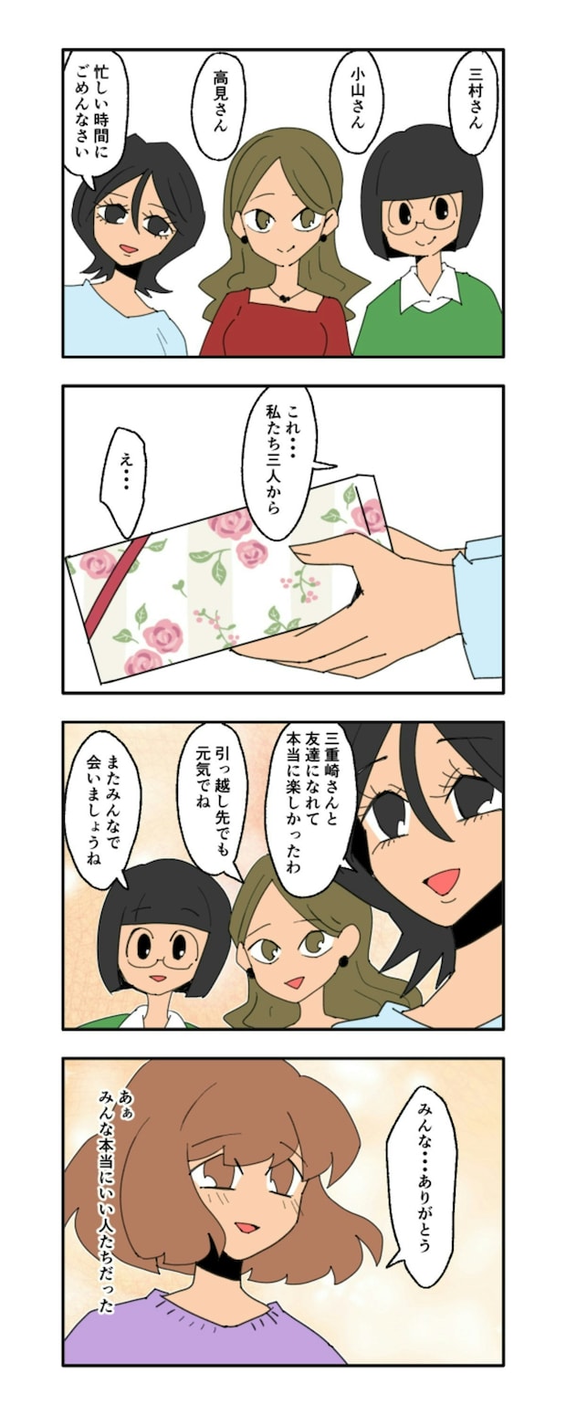 引っ越し当日、ハルミは親しくしていたママ友たちから餞別を受け取りました。そのとき、最後まで自分のことを大切に思ってくれたママ友たちと出会えたことへの感謝の気持ちと、この環境を離れることへの寂しさが心に広がりました