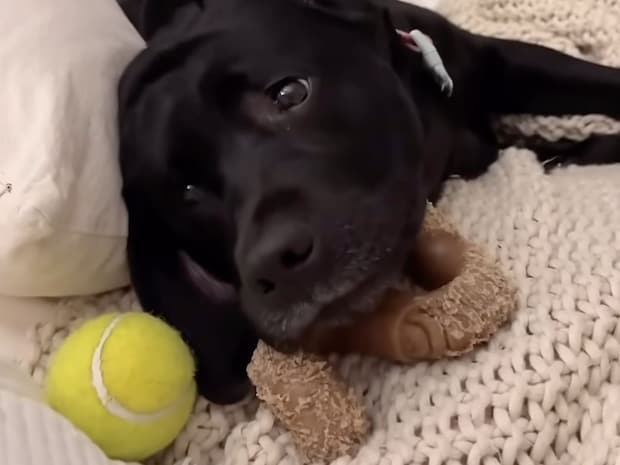お気に入りのテニスボールやおもちゃに囲まれながら、