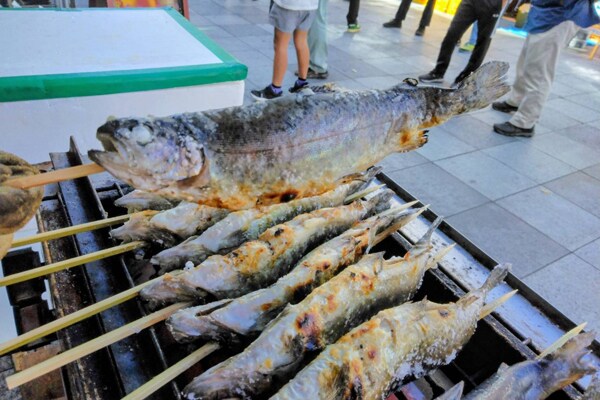 富士養鱒漁業協同組合による、焼きたてのニジマスの塩焼き、イワナの塩焼き、静岡サーモン入りクリーミーコロッケなどもお目見え。