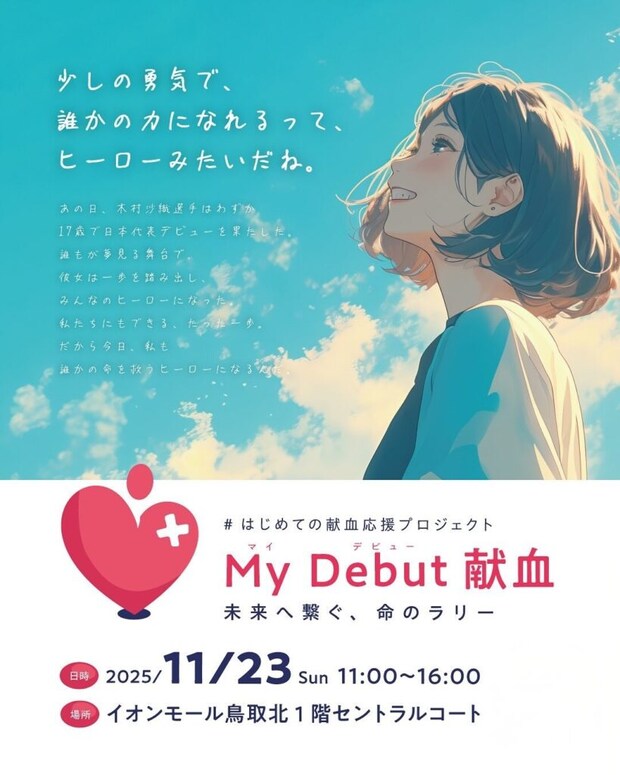 2025年11月23日(日)に、鳥取市のイオンモール鳥取北で開催される献血応援イベント「#はじめての献血応援プロジェクト My Debut(マイデビュー)献血」!