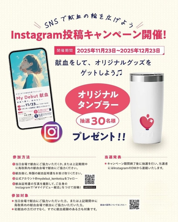イベント会場または鳥取県内の献血会場で献血に協力した際に、特製の献血証明書を受け取り、Instagramに投稿すると、オリジナルタンブラーが抽選で当たります。