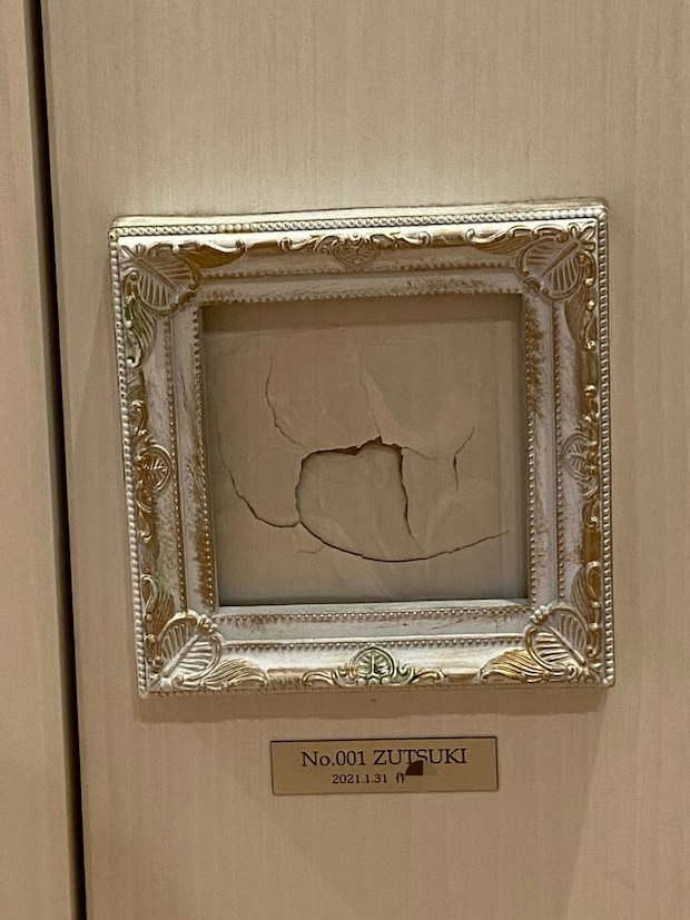 子どもがトイレの扉に頭突きして穴が…。幸い本人は大きなケガも無かったそう。ドアを取り替えるか迷った時期もあったそうですが、ドアの穴は「子育てしてきた証」。そこで髙桑弘基@ハッカ樹氷の中の人さんは、「これはもう、飾ってしまえばいいのでは」と額縁をかけて、タイトル「No.001 ZUTSUKI」を付け、日付も記入。このように額に入れると、ちょっとしたアート感がありますね。