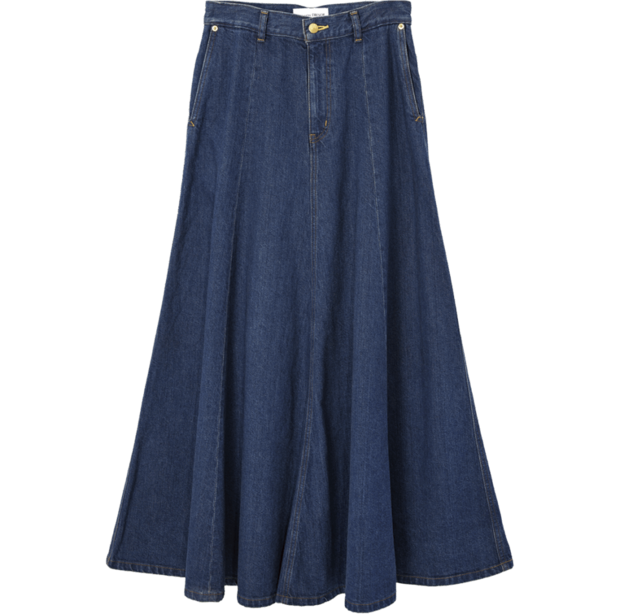 「なかなかないマキシ丈にキュン♡ 久しぶりにデニムスカート気分じゃないですか? これはマキシ丈で、ちょっとズルッとはきたいなって。足元は秋はまだビーサンでもいいですよね」
