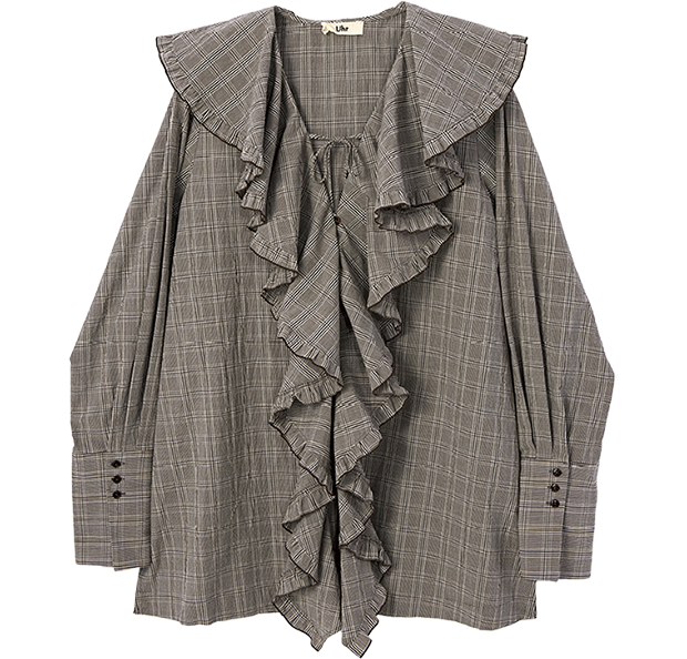 「ダッド感のあるクラシックなグレンチェック柄をこんなにエレガントに落とし込むなんて♡ と展示会で真っ先に手に取ったブラウス。秋口はヴィンテージTシャツに重ねたりしたいなと」