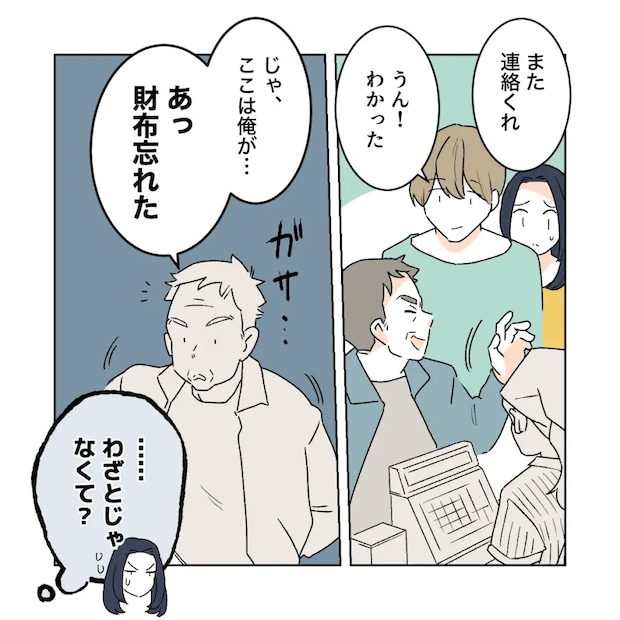 「また連絡くれ」「うん!わかった」不安げな私をよそに、楽しそうに会話を続ける2人。義父はレジの前に立つと「じゃ、ここは俺が・・・」と財布を出すふりをしますが、次の瞬間「あっ財布忘れた」と一言。わざとらしい言い方に、私の中の不信感はさらに強まります。