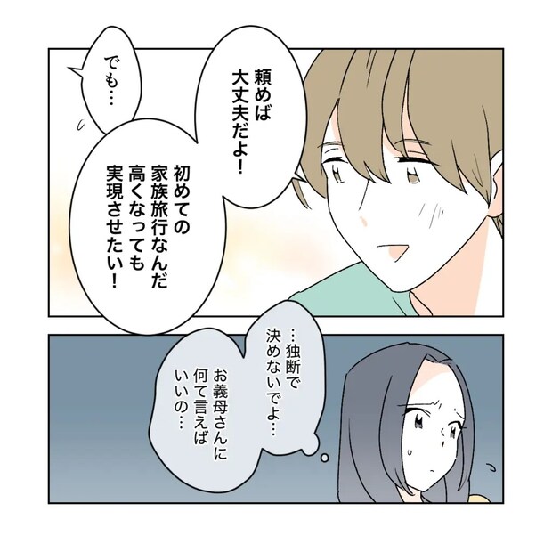 しかし、ショウタは浮かれているのか「頼めば大丈夫だよ!初めての家族旅行なんだ、高くなっても実現させたい!」と周りが見えていない様子。こんな強引に自分の意見を押し通すことなんてないのに・・・私は普段と違うショウタに不安になりながらも、言葉を飲み込みました。