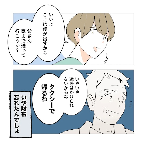 「いいよ、ここは僕が出すから、父さん家まで送って行こうか?」食事代を払ううえに、帰りの心配までするショウタ。親切にもほどがあります。すると義父は「いやいや迷惑はかけられないからな、タクシーで帰るわ」と財布もないのに言いました。