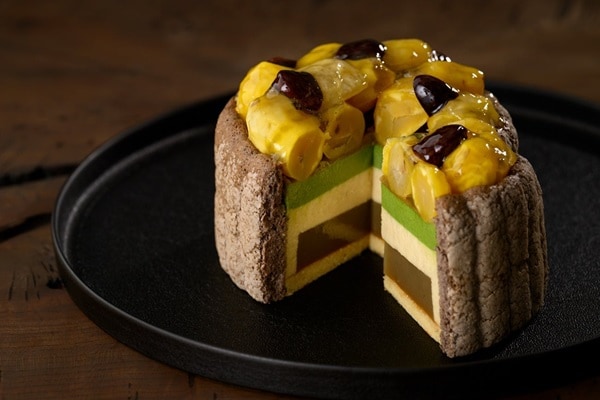ビスキュイ生地で覆われたシャルロットケーキの中には、滑らかな口当たりの栗のムース、抹茶のムースと栗餡を重ね、さらにその内にアクセントの栗羊羹を忍ばせた。一般的な栗よりも大粒で、甘みとほくほく感に優れる岸根栗。収穫時期が遅い晩成種のため加工に向かず、これまであまり流通しなかった幻の栗を、あえてメイン素材として贅沢に使用した。