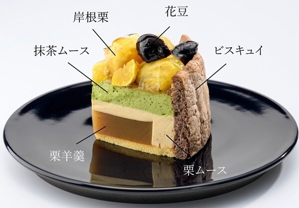 贅沢にトッピングした大粒の岸根栗と花豆(信州産)が食感のインパクトを与える、様々な味わいが折り重なった仕上がり。思う存分和栗のおいしさが楽しめるスペシャルケーキとなっている。
