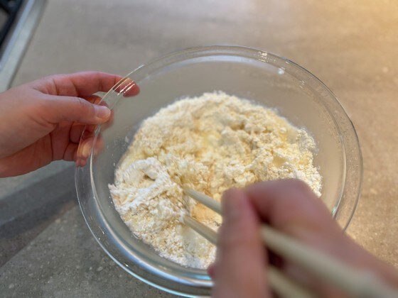 皮も手作りです!ボウルに粉類、塩、熱湯を加えてまぜます。手で触れる温度になったらボウルの中でまとまるまでこねます。