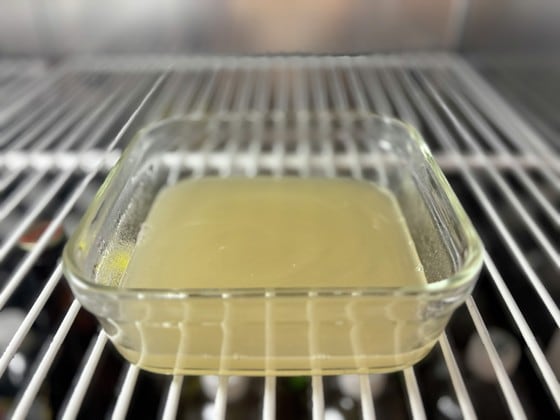 まずはスープ作りから。鍋に水を入れ沸騰したら、中華スープの素とゼラチンを加えて、保存容器に入れて冷蔵庫で固めます。