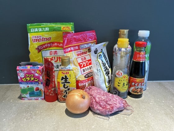 次に具を用意します。玉ねぎはみじん切りにして、生姜は今回はチューブで代用。調味料を全て入れて、よくまぜたら冷蔵庫に入れておきます。