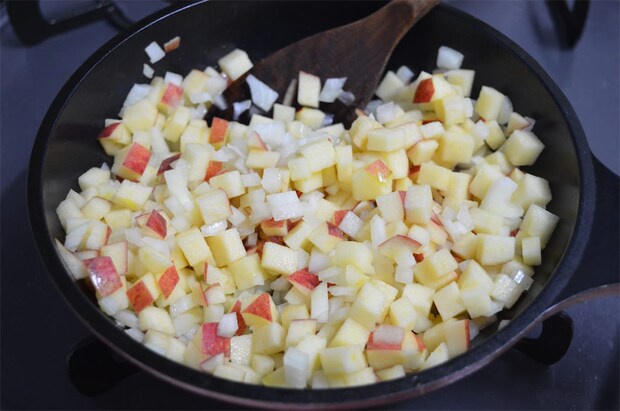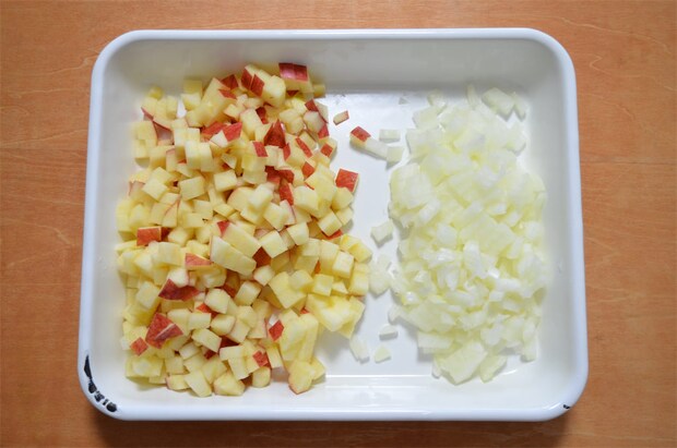 1. りんごは1cmほどの角切り、玉ねぎを粗めのみじん切りにする。