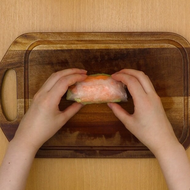 3.ライスペーパーを水にくぐらせ、にんじん、ツナマヨ、レタスをそれぞれ1/4量重ねて包む。同様に計4本作る。