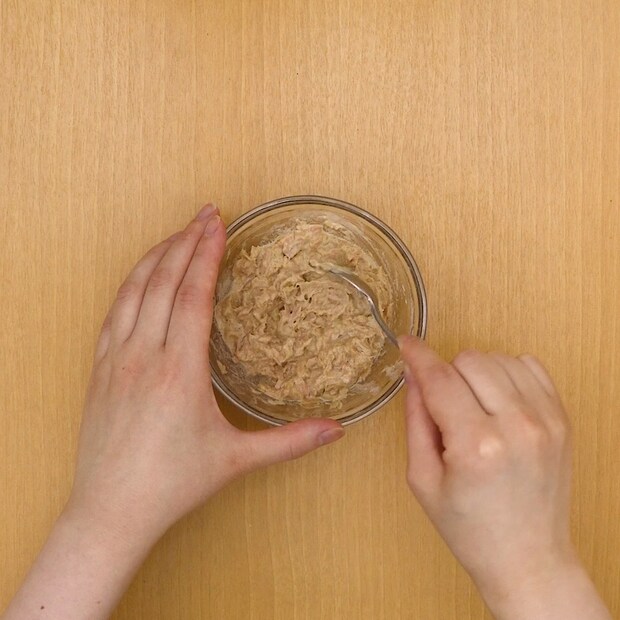 2.ボウルにツナ缶、マヨネーズ、しょうゆを入れて混ぜる(ツナマヨ)。