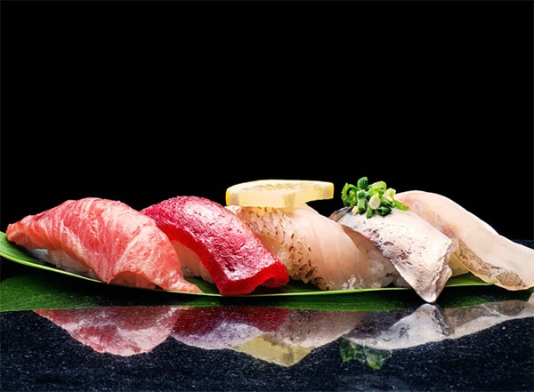 寿司皿には、「寿司といえば、富山」ブランディングプロジェクトで制作した「わたしたちの、工芸寿司皿 SUSHI PLATE」を使用。富山県内24人の工芸作家や職人が手がけた寿司皿で、漆芸、彫金など、400年以上受け継がれる技を生かした「回転寿司皿」モチーフの一点もの44種だ。