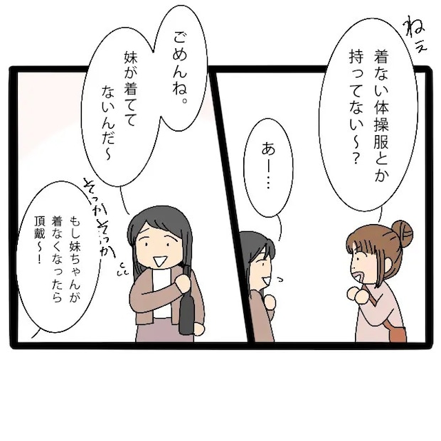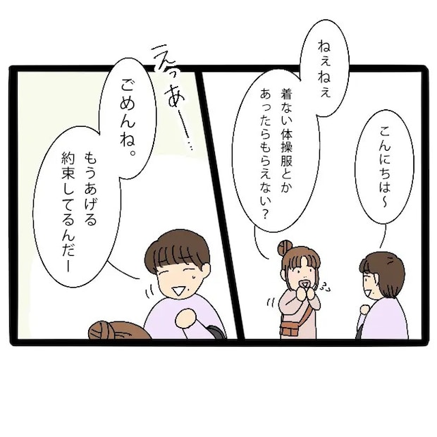 さっそくターゲット発見!私はすぐに駆け寄り、「ねぇねぇ、着ない体操服とかあったらもらえない?」と声をかけます。するとママ友は気まずそうに笑いながら、「えっあー・・・ごめんね、もうあげる約束してるんだー」と答えました。