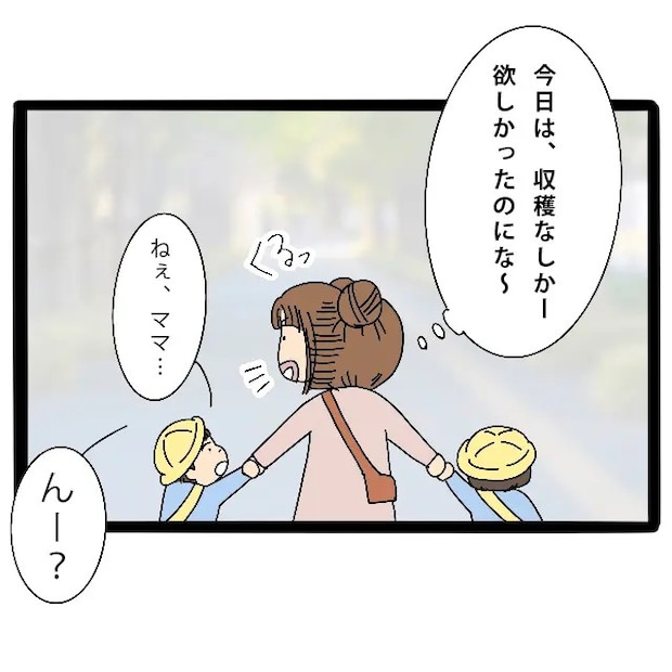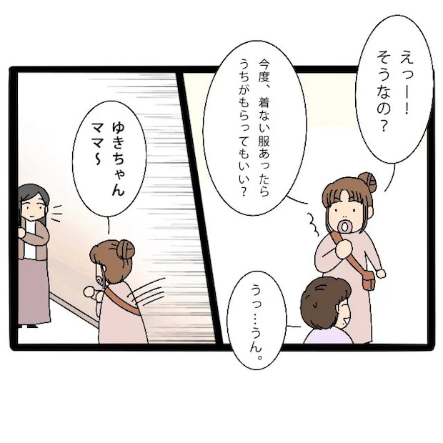 結局その日は収穫なし。おさがりの洋服は1枚も手に入りませんでした。「欲しかったのになぁ・・・」と心の中でため息をついていると、そらが「ねぇ、ママ・・・」と声をかけてきました。