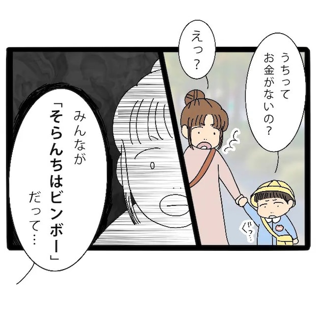 そらは私に「うちってお金がないの?」と聞きました。思いがけない言葉に、私は「えっ」と驚きます。そらは悲しそうな顔で「みんなが『そらんちはビンボー』だって・・・」とつぶやきました。その瞬間、私の頭は真っ白にー・・・もしかして、そら、いじめられてる?