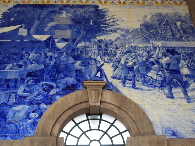 壁面を覆うアズレージョには、ジョアン1世のポルト入城(1385年)やセウタ征服(1415年)、ヴァルデヴェスの戦い(1140年)といった歴史的場面が描かれています。また、農村の田園風景や祭りなど、庶民の日常生活も表現されており、ポルトガルの歴史と文化を一望できる「タイルの博物館」とも言える空間です。