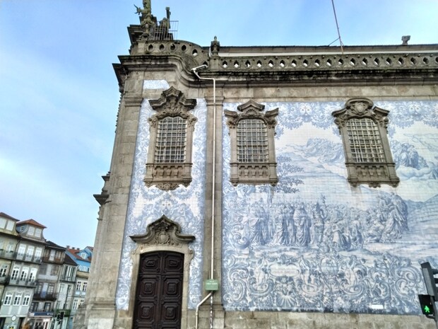 カルモ教会のアズレージョは、ポルト市内でも最大級の規模を誇る外壁装飾で、青と白のタイル画が壮大に広がっています。