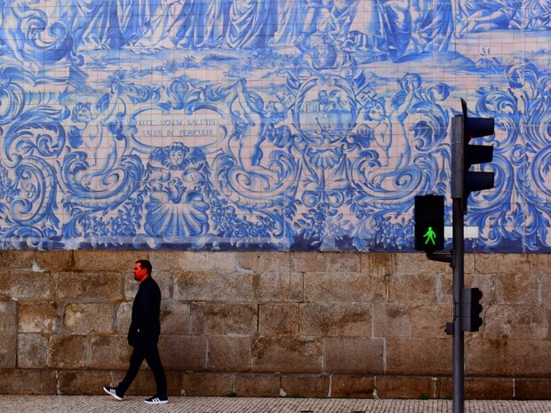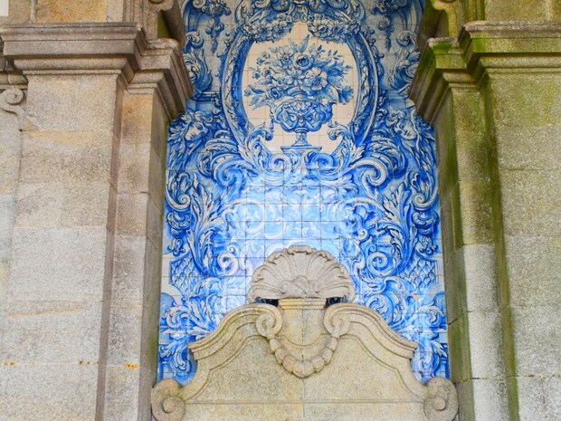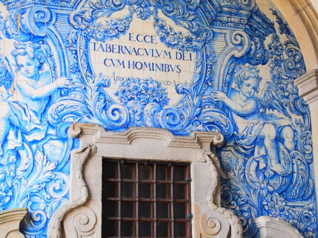 サント・イルデフォンソ教会のアズレージョは、ポルトの街並みを象徴する壮麗な外壁装飾で、約11,000枚の青と白のタイルにより聖イルデフォンソの生涯が描かれています。