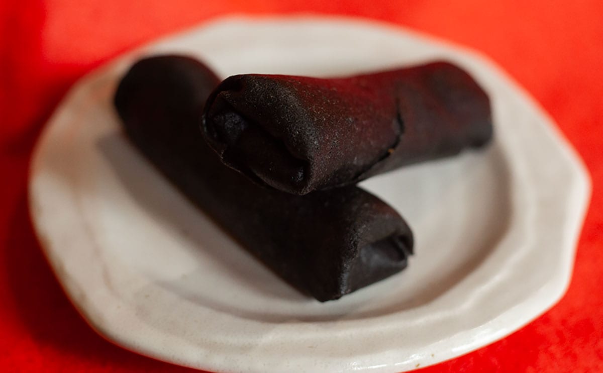 セブン-イレブンは、この商品を説明するにあたり特に言及はしていないのですが、商品名にも入っているとおり「黒」がポイント。こんがり茶色の春巻に慣れていると、びっくりしますね。