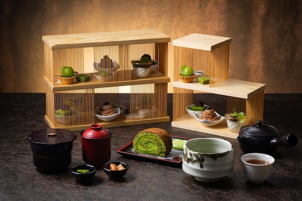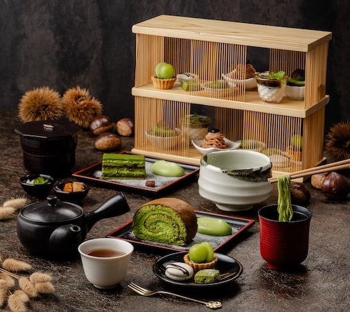 棚には栗や安納芋といった秋の味覚と、こだわりの抹茶を使用したスイーツがずらりと並び、さらに、シャインマスカットや松茸といった豪華な食材を使用したメニューまで楽しめる、贅沢な茶フタヌーンティーとなっている。