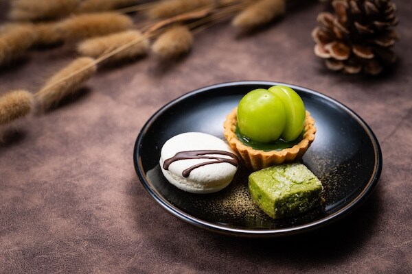 贅沢にシャインマスカットを使用した抹茶のタルトは、爽やかな甘みと濃厚な抹茶の風味が絶妙に溶け合う一品。