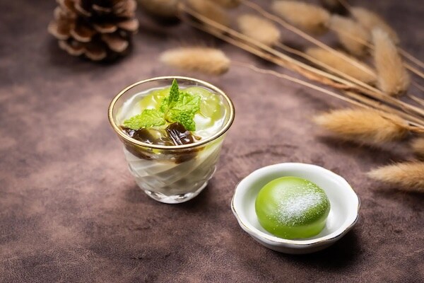やさしい甘さのミルクプリンにシャインマスカットとほうじ茶ゼリーを合わせたマスカットみるくプリンは、仕上げのレモンジュレで爽やかな味わいに。