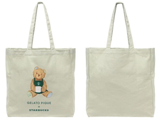 しっかりとしたキャンバス生地のマチ付きの大容量トートバッグ。グリーンエプロンを着てマグカップを持ったコラボレーション仕様の「ピケベア」とコラボロゴを前面に大きくプリントしている。税込4,900円。