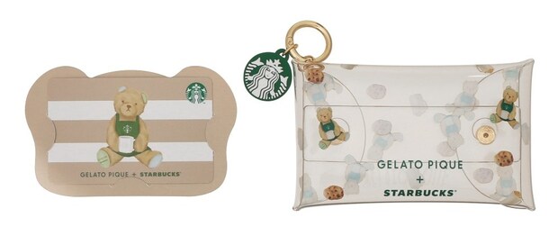 2,000円が入金済のスターバックスカードとマルチケースのセット。マルチケースには、スターバックスの「チョコレートチャンククッキー」や「キャラメルマキアート」、コラボ仕様のピケベアなどをデザインした。リングが付いているため、バッグに付けることも可能。税込3,980円。