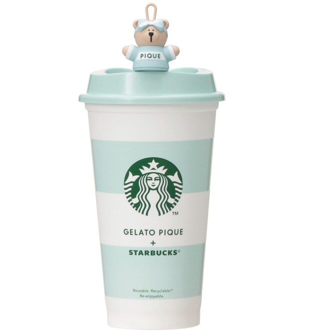 パステルカラーのボーダーをデザインしたカップ型のステンレスボトル。カラーバリエーションは3種。前面にはスターバックスのサイレンとコラボレーションのロゴを、背面にはコラボ限定の「ピケベア」を配した。中身が漏れないよう、フタにはスライド式のロック機能付き。真空二重構造ステンレスで保温・保冷性に優れているという。好きなドリンク1杯と無料で交換できるチケット付き。税込6,000円。