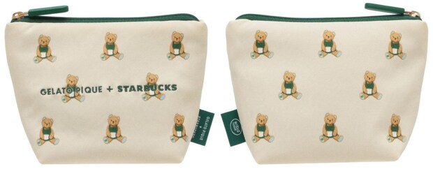 小さなバッグにも入れやすいコンパクトなサイズ感のポーチ。デザインは、グリーンエプロンを着てマグカップを持った「ピケベア」の総柄となっている。コラボレーションのロゴを刺繍した。税込4,800円。