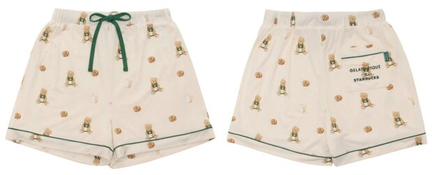とろみのあるカットソー素材の総柄ショートパンツ。スターバックスの「チョコレートチャンククッキー」「キャラメルマキアート」をイメージしたオリジナルのイラスト、グリーンエプロンを着てマグカップを持ったピケベアなどをデザインした。裾のパイピングと紐にスターバックスのグリーンを使用。後ろのポケットには、コラボロゴを刺繍した。税込7,000円。