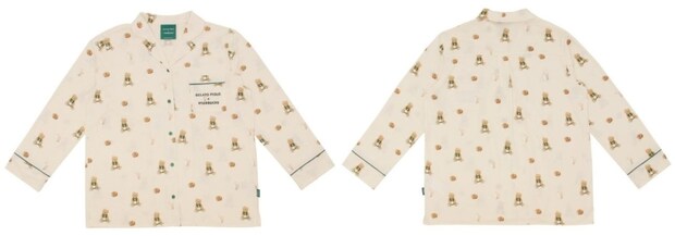 とろみのあるカットソー素材を使った、ゆったりとしたシルエットのシャツ。総柄のデザインは、今回のコラボのために描き起こされた、スターバックスの「チョコレートチャンククッキー」「キャラメルマキアート」をイメージしたオリジナルのイラスト、グリーンエプロンを着てマグカップを持ったピケベア。ボタンやパイピングに、スターバックスらしいグリーンを効かせ、胸ポケットにはコラボロゴを刺繍した。税込9,900円。