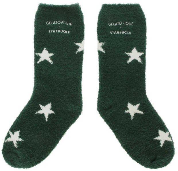 ふわふわでさらりとした肌当たりのもこもこ素材を使ったルームソックス。スターバックスらしいグリーンに、星のモチーフをジャガードで表現した。サイドにはコラボロゴを刺繍した。税込3,900円。
