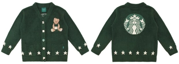 ふわふわでさらりとした肌当たりのもこもこ素材を使ったカーディガン。スターバックスらしいグリーンを基調に、星のモチーフや、エプロンを着てマグカップを持ったピケベア、スターバックスのサイレンをデザインした。税込1万5,000円。
