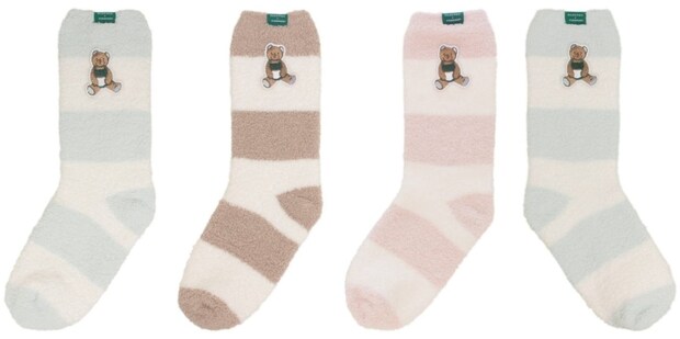 もこもこ素材を使ったルームソックス。カラーバリエーションは3種。コラボ仕様のピケベアのアップリケ刺繍が特徴。各税込3,900円。