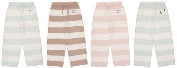 もこもこ素材のストレートシルエットのロングパンツ。カラーバリエーションは3種。2色ボーダーのデザインに、コラボロゴを刺繍し、後ろポケットにはコラボ仕様のピケベアのアップリケ刺繍を配した。各税込9,900円。