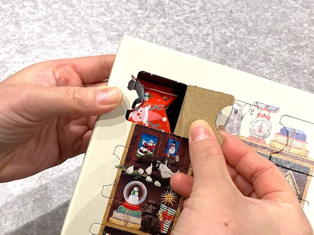 シールを貼り付けた小さな扉を開けると、中にはチョコレートが入っていました!扉の見開き部分にもプレゼントのイラストが描かれており、細部までこだわって作られているのがわかります♪